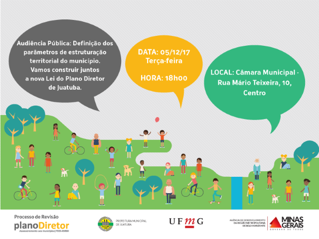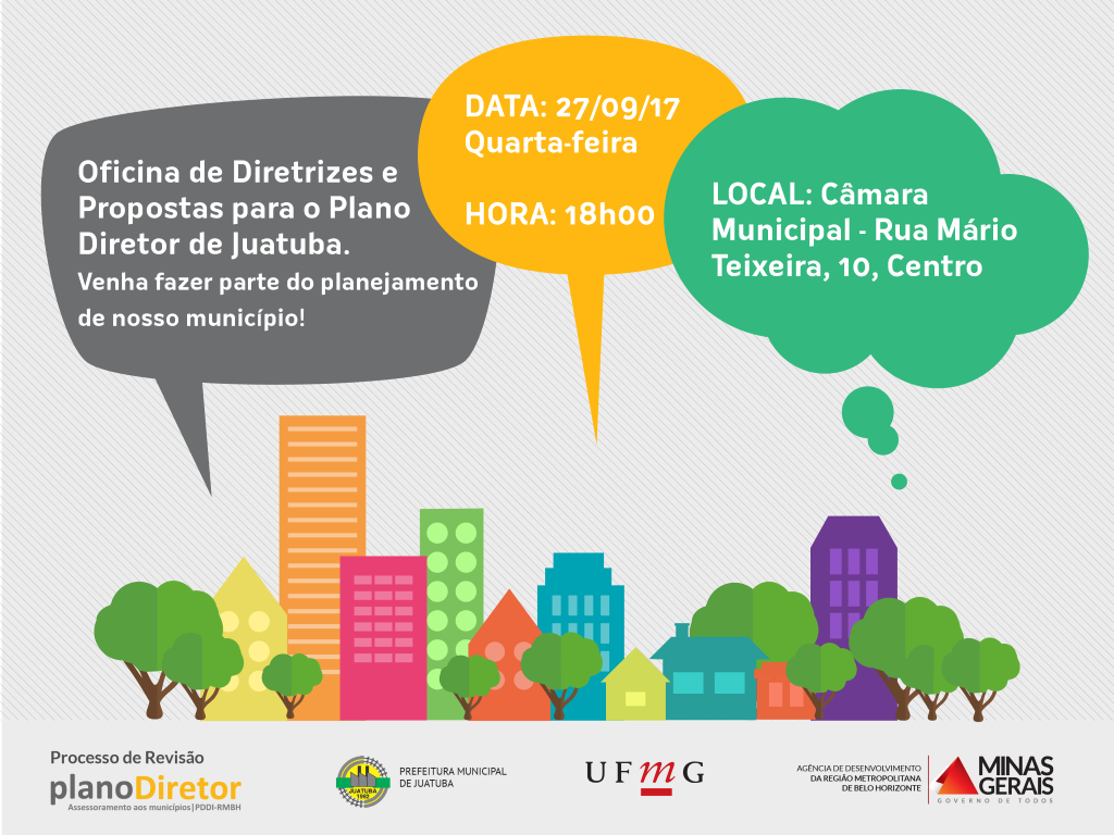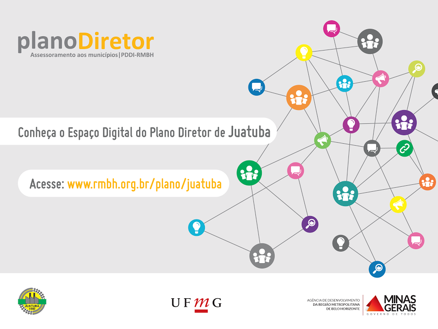 A revisão do plano diretor do município de Juatuba encontra-se no décimo mês de atividades e desde novembro de 2016 estão sendo promovidos encontros; debates; estudos; e mapeamentos colaborativos, processo este que vem sendo consolidado nos relatórios técnicos que já se encontram disponíveis ao público no Espaço Virtual do Plano Diretor: www.rmbh.org.br/plano/juatuba