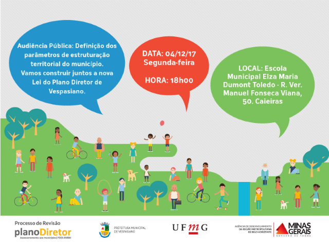 O Plano Diretor de Vespasiano entra na reta final do seu processo de revisão e para esta fase a equipe técnica da UFMG usou de toda a coleção de informações reunidas ao longo de um ano de trabalho, para elaborar uma síntese da realidade municipal, um produto que está sendo consolidado na forma de um relatório técnico e que, em breve, estará disponível no Espaço Digital do Plano Diretor, juntamente com os demais produtos, fotos e mapas deste processo de revisão.