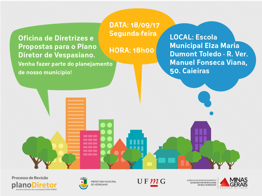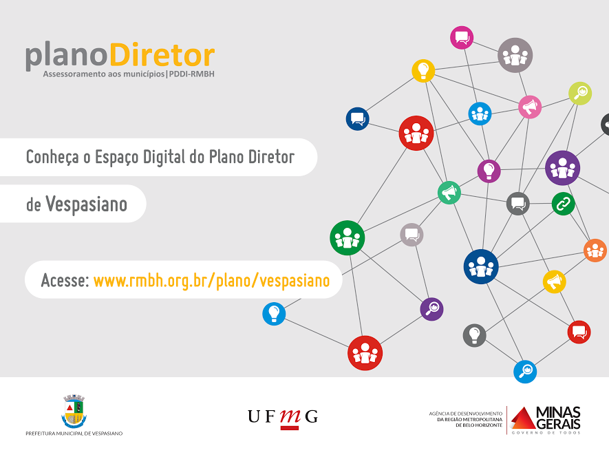 A revisão do plano diretor do município de Vespasiano encontra-se no décimo mês de atividades e desde novembro de 2016 estão sendo promovidos encontros; debates; estudos; e mapeamentos colaborativos, processo este que vem sendo consolidado nos relatórios técnicos que já se encontram disponíveis ao público no Espaço Virtual do Plano Diretor: www.rmbh.org.br/plano/vespasiano