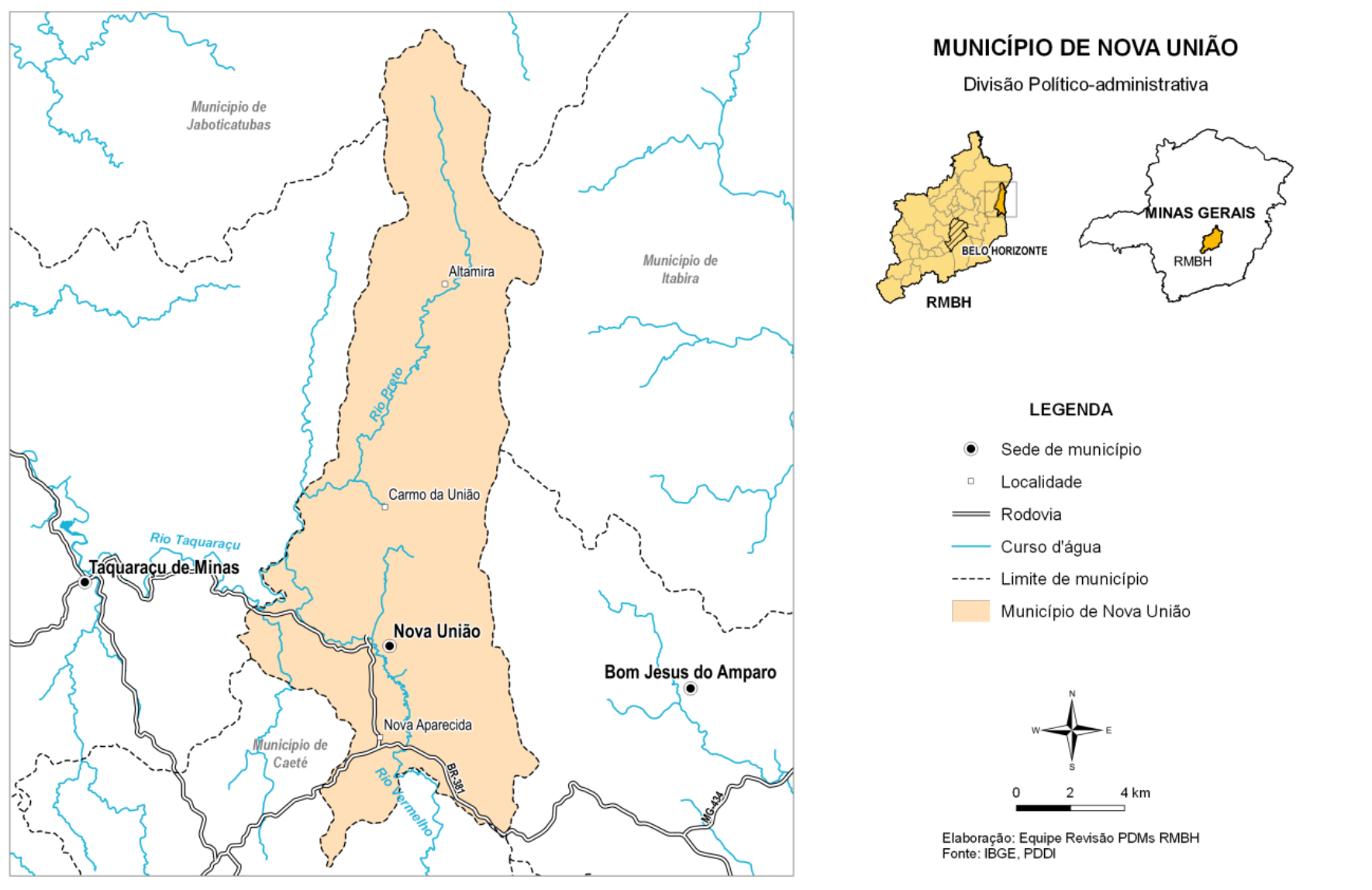 A Figura a seguir traz a localização do município no contexto estadual e microrregional, distante 55 km de Belo Horizonte. Além da sede do município, compõe seu território os povoados de Altamira, Baú, Bernardo, Carmo, Arraial dos Lopes, Monte Horeb, Nova Aparecida e Santo Antônio.